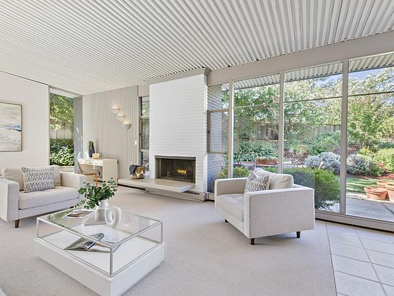 This charming home embodies mid-century design with its flat planes, geometric lines & large picture windows that welcome the indoors with nature. Walls of windows flood the interior with natural light & frame the picturesque view of the backyard. The open-concept layout of the living & dining rooms provides a seamless flow, perfect for entertaining guests or relaxing with family. Classic galley kitchen with ample storage. Step outside into your own private paradise & live the quintessential indoor/outdoor California lifestyle. The beautifully landscaped yard is a quiet escape with two entertaining patios, & plenty of space for gardening, play, & leisure. The bedroom wing has a spacious primary suite + 3 more bedrooms. Attached 1-car garage + open carport for convenient covered parking. Convenient to the Ladera Rec., neighborhood paths & the Ladera Shopper. Only 3.5 miles to Stanford, easy access to Silicon Valley, commute routes & mid-way between SFO & SJC International airports.