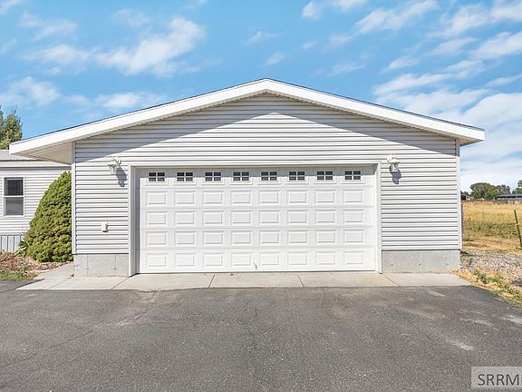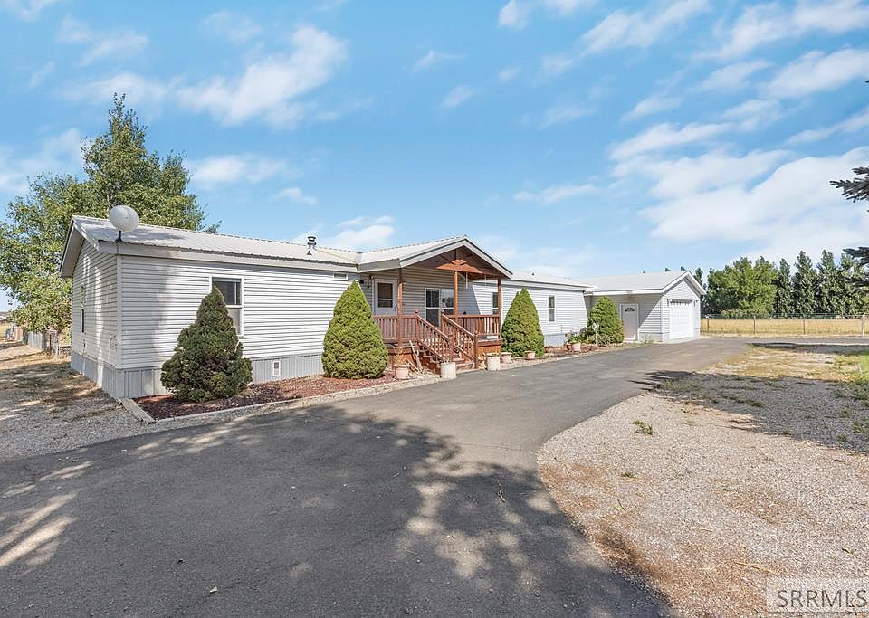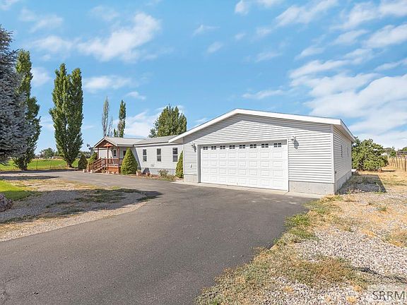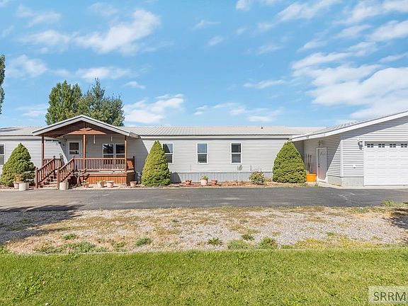 Discover this adorable manufactured home in Rigby, on a spacious 0.83-acre lot. This charming residence boasts a single-level, open-concept layout that creates a warm and welcoming atmosphere. At the heart of the home is a spacious kitchen with a moveable island, perfect for meal preparation and entertaining guests. Adjacent to the kitchen, the dining area serves as an ideal spot for family meals and gatherings. The home offers ample relaxation space with both a family room and a large living room. A conveniently located laundry room enhances the ease of daily chores. The primary suite features a sizable bathroom and a walk-in closet, while an adjacent den or office space provides versatility as a potential craft room or extra living area. Outside, the large, enclosed backyard is perfect for activities and pets. The property includes a workshop and storage area, complemented by a covered deck for enjoying the views. A paved circular driveway ensures easy access and parking, and an oversized 2-car garage offers plenty of room for vehicles and additional storage. The natural beauty of the surroundings is highlighted by fruit trees and vibrant flower beds. Located just minutes from Kelly Canyon Ski Area and Heise Hot Springs, this home is perfect for outdoor enthusiasts.