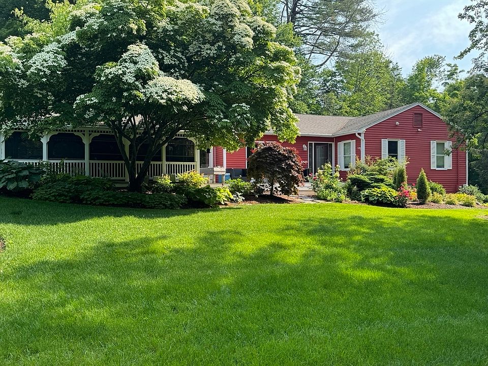 Journey to The Hosta Haven. Drive up the hosta lined driveway and observe the peaceful forest. Step onto the custom stone walkway to see the immaculately manicured private yard. This lovely contemporary ranch style home with an open floor plan is the home of your dreams! When you walk into the kitchen you will view the true Heart of the Home! It was designed and built by an award-winning woodworker and the current owner of the home, along with the oak floors and custom padauk inlays. The Cabinetry is made of quilted maple and padauk and houses a wine fridge, wet bar, tile back splash, Quartz counter tops, pot filler, custom wine cabinet and more. The Primary suite offers two closets and bathroom with shower. Two additional bedrooms and a remodeled full bath offer space and convenience for all. The basement was used as a woodshop, but could easily be finished into more living space. Finally, enjoy the 12x24 Pavilion with a Hot Tub and infrared heaters making it a year-round space.