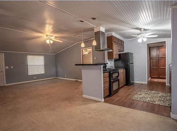 Nice manufactured home and plenty of space on this 1 acre+ wooded lot. Features 3 bedrooms, 2 bath rooms, utility room and office combo. Kitchen has breakfast bar, walk in pantry and granite tile counter tops. Refrigerator can stay. Split bedroom floor plan. Large deck in back for relaxing. Two storage buildings, one has a electric for workshop. 24x36 Garage! Foundation is sturdy concrete block perimeter. Roof being installed September 2021 with 30 year shingles.