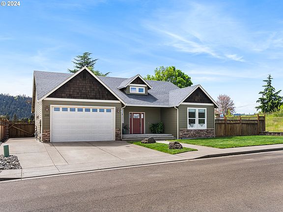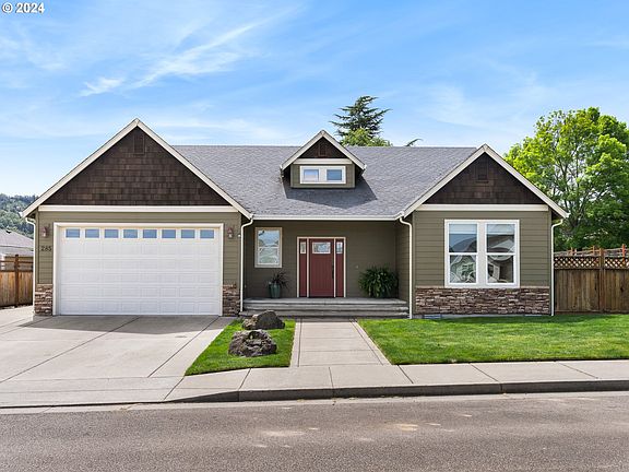 Step into the warmth and comfort of this inviting single-level home nestled in Winston, Oregon! Boasting 1,792 square feet of meticulously maintained living space, this turn-key residence offers the convenience of purchasing with all appliances included, along with a TV and surround sound system! As you approach, the charming covered front porch invites you to unwind with your morning coffee or peaceful evenings. Once inside, be welcomed with a spacious open-concept layout featuring 3 bedrooms and 2 full bathrooms. The primary bedroom serves as a tranquil oasis, featuring a vaulted ceiling, ensuite bathroom with a soaking tub, walk-in shower, and a generously sized walk-in closet! Entertaining is effortless in the well-appointed kitchen, boasting an island with an eat bar, ample cabinet space, and warm tones that create an inviting ambiance. Adjacent to the kitchen, the living room offers vaulted ceilings and a gas fireplace, perfect for cozy gatherings on chilly nights. Additional highlights include wood floors, a convenient laundry room with washer/dryer and built-ins, and a spacious and deep garage providing plenty of storage! Step outside to explore the well-maintained 0.19-acre lot, featuring a fenced backyard with a covered patio, additional patio space, a handy tool shed, and stunning landscaping. Indulge in outdoor cooking with the convenient gas hookup for your BBQ! Conveniently situated just 0.6 miles from coffee shops, groceries, shopping, and recreational amenities such as Riverbend Park and the skatepark, this home offers the perfect blend of comfort and convenience. Don't miss the opportunity to make this Winston gem your own!