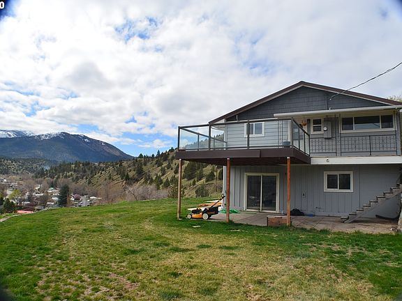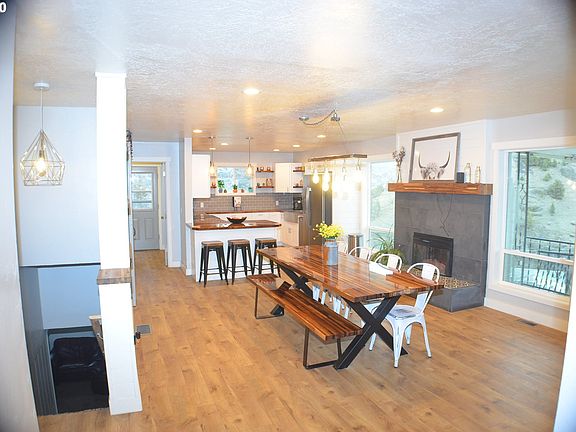Private setting that overlooks town. This home has been remodeled with a modern farmhouse design. 2,700 sq ft of living space, 4 bedrooms, 2 ¾ bathrooms, living rooms on both levels, attached 2 car garage & 290 sq ft shop/outbuilding. Butcher block counter tops and accents throughout. Sliding barnwood doors. Master suite has walk in tile shower. Great deck to take in your fantastic views. Heat pump, vinyl windows, metal roof, 2 electric fireplaces, irrigation system, new septic 2019.Agent Owned