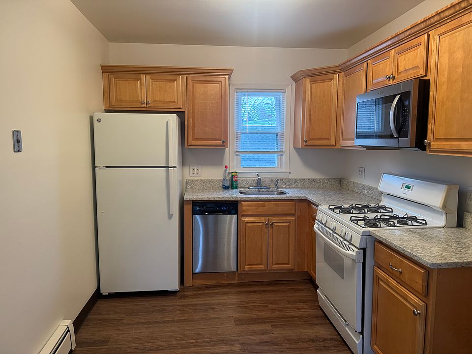 Lovely second floor one bedroom apartment. Features kitchen with gas range, dishwasher, microwave, and refrigerator. Bathroom has a new medicine cabinet and new vanity. Bedroom features new wall to wall carpet, ceiling fan and two spacious closets. Hallway has another spacious closet and there is also a coat closet. Gas heat and on site shared laundry. No Smoking and no cats or dogs allowed. One off street parking spot. One year lease and credit score of 650 or higher required. Tenant pays their own gas, electric, and internet. One year lease. No pets, no smoking. 1 off street parking spot. Credit score must be 650 or better.