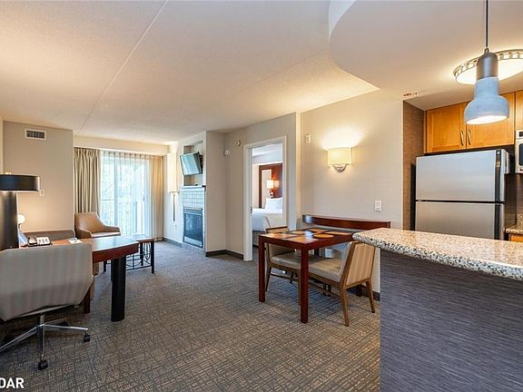 INCREDIBLE TURN-KEY INVESTMENT OPPORTUNITY ON LAKE MUSKOKA! Turn your Muskoka getaway into a smart investment with this incredible suite at the Residence Inn by Marriott Muskoka Wharf in Gravenhurst. Fully furnished with tasteful finishes and timeless design, this 1-bedroom unit spans over 500 sq ft and features a kitchen with stainless steel appliances, an eating area, and a living room enhanced by a gas fireplace and walkout to a private balcony with water views. The primary bedroom is appointed with a king bed, while the 4-piece bathroom completes the layout. Owners enjoy 35 days of personal use per year with the balance in a hotel-managed rental program that potentially generates income. Premium amenities include concierge service, fitness room, indoor pool and hot tub, media room, party room, business centre, coin laundry, daily continental breakfast, and a 24-hour coffee and tea bar. Situated directly on Lake Muskoka, you are steps from the scenic Muskoka Wharf boardwalk, the interactive Muskoka Discovery Centre, and Bethune Memorial House. Enjoy lakeside walks on the Peninsula Trail, catch a show at the nearby Opera House, explore local parks, and dine at a variety of restaurants, with year-round activities including boating, swimming, golfing, hiking, biking, snowmobiling, and ice fishing at your fingertips. An ideal opportunity to own in Muskoka with personal enjoyment and potential income all in one!