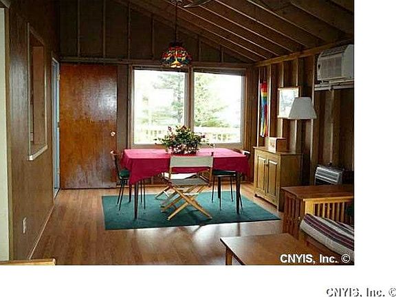 Beautiful property nestled between the north shore of Sandy Pond and Lake Ontario. Over 160'total water frontage. Trophy fishing on the lake or fish from your dock in the pond. When the lake is rough - move to the pond side and have a ball. Turn-key offering..just bring your clothes-everything else is there from the linens to the dishes to the patio furniture. Pontoon boat being sold separately. This cottage is located mid way between the channel and the state park. Accessible year round by boat or SUV. There's even a heater for when it gets really cold!!