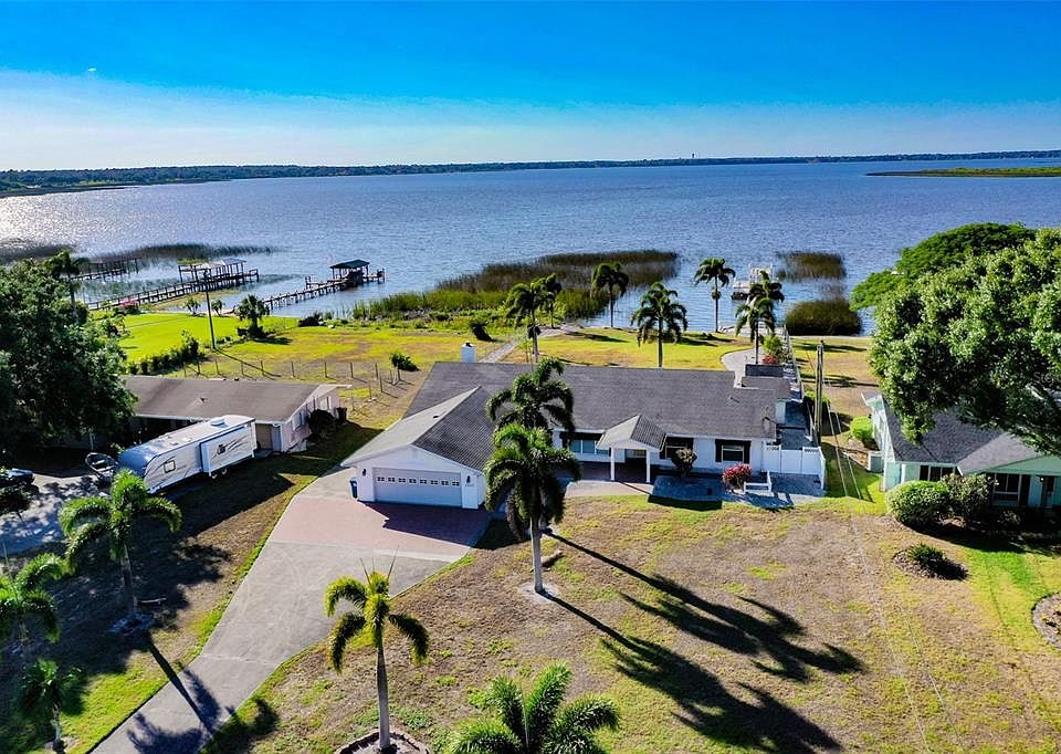 Welcome home to this spectacular lakefront home that sits on nearly 3/4 of an acre of land with 100 feet of lake frontage with a metal sea wall and your own private dock with upper deck and covered boat hoist. You're greeted on to the land with a large driveway that is lined with mature landscaping that draws you to your oversized 2 car garage as well as a covered front entry way and then into the home. Inside you can enjoy nearly 3000 square feet of air conditioned space with panoramic views out over the water from almost all of the rooms. The kitchen opens out to the formal living area and breakfast nook which is next to the formal dining area allowing for a great entertaining area. The laundry room is oversized with plenty of cabinets and storage as well as the great room being huge and opening out to another living area which has a wood burning fireplace for you to relax in-front of. The master bedroom boasts an attached bathroom with walk-in shower, closet as well as its own private living area or office and the other 2 bedrooms are across the hallway and share the other bathroom. Enjoy and take in the breathtaking sunset views out over the water with mature landscaping, fenced in back yard and multiple storage buildings for you to keep items out of the florida weather. This home is a must see property so schedule a private tour asap.