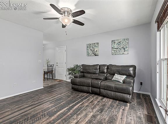 This fantastic ranch home features a single-level floorplan with a move-in-ready appeal. Walking in, you will be greeted by stunning hardwood laminate floors and fresh, soothing paint in the large, inviting living room. This room offers a coat closet right next to the entrance, and a beautiful ceiling fan that brings the room together as well as helps maintain an ideal climate. From the living room, the home opens to a huge eat-in kitchen. The kitchen features tons of cabinet space including a deep tower cabinet, a newer dishwasher, a side-by-side refrigerator with water and ice, a glass top range oven, oven hood, and disposal. The kitchen provides a walk-out to the fully fenced rear yard as well as direct access to the attached 1-car garage which hosts more cabinet storage as well as attic access. This home has three sizable bedrooms, all freshly painted in clean and soothing tones. A full bathroom and open laundry closet are placed just before the bedrooms. The laundry closet included a washer and dryer, as well as two levels of storage shelving. The bathroom provides a large countertop and has a door separating the tub area, allowing someone to shower without blocking access to the toilet and sink. This bathroom also has direct access from the primary bedroom at the end of the hall. Multiple hall closets throughout the home help ensure storage is not a problem. This charming home offers a sprawling backyard with a wood deck, concrete patio, and a built-in firepit perfect for outdoor entertaining or just relaxing with family and friends. The home backs to the Giberson Elementry School and Park and is perfectly placed for easy access to shopping, restaurants, entertainment, the Colorado Springs airport, Peterson Space Force Base, Ft Carson and so much more.
