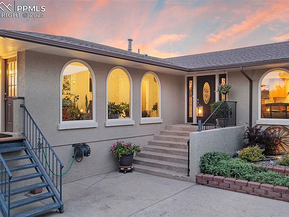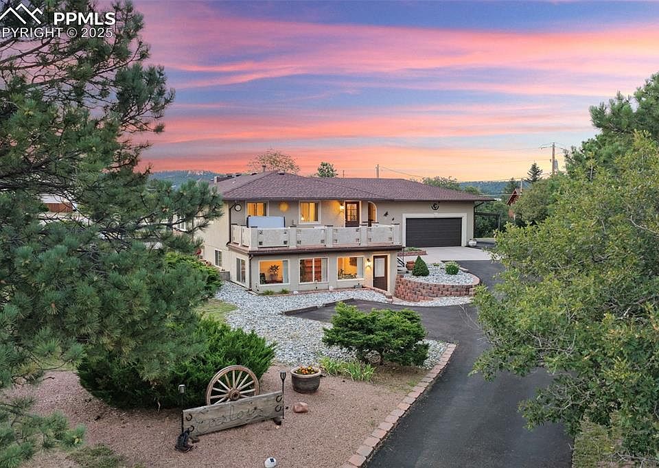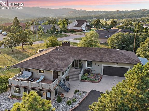 This is the home you’ve been waiting for! Nestled on the west side of Monument with no HOA, this beautifully maintained raised ranch sits on just over half an acre with breathtaking views of Mount Herman and the mountain range. Offering 3 bedrooms, 2 bathrooms, a 2-car garage, attached carport, shed, and RV parking, this property provides both space and flexibility. Step inside to a light-filled hallway perfect for plants, leading into the open-concept kitchen and living room. The kitchen features granite countertops, wood cabinetry with pull-out shelving, stainless steel appliances, a gas cooktop, and island—with the sink overlooking the fenced backyard and mountain views. The dining area flows into the spacious living room, where a wall of windows and a stone-surround wood-burning fireplace create a warm, inviting atmosphere. A sliding door opens to the backyard, perfect for entertaining. The main-level primary suite boasts a luxurious five-piece bath with granite double vanities, soaking tub, walk-in shower, and private water closet. Upstairs windows frame incredible views, while the lower level offers a large rec room with a second fireplace, a wet bar with granite counters and wine fridge, a laundry room with appliances included, two bedrooms, a ¾ bath, and a versatile sunroom/office with outdoor access. Additional highlights include new carpet, multiple new windows, air conditioning, upper-level deck with hot tub, outdoor kitchen, and extensive storage. The landscaped lot offers privacy, ample parking, and unbeatable views—all minutes from downtown Palmer Lake and Monument with easy access to Colorado Springs and Denver. With no HOA and endless charm, this gem combines comfort, style, and mountain living at its best!