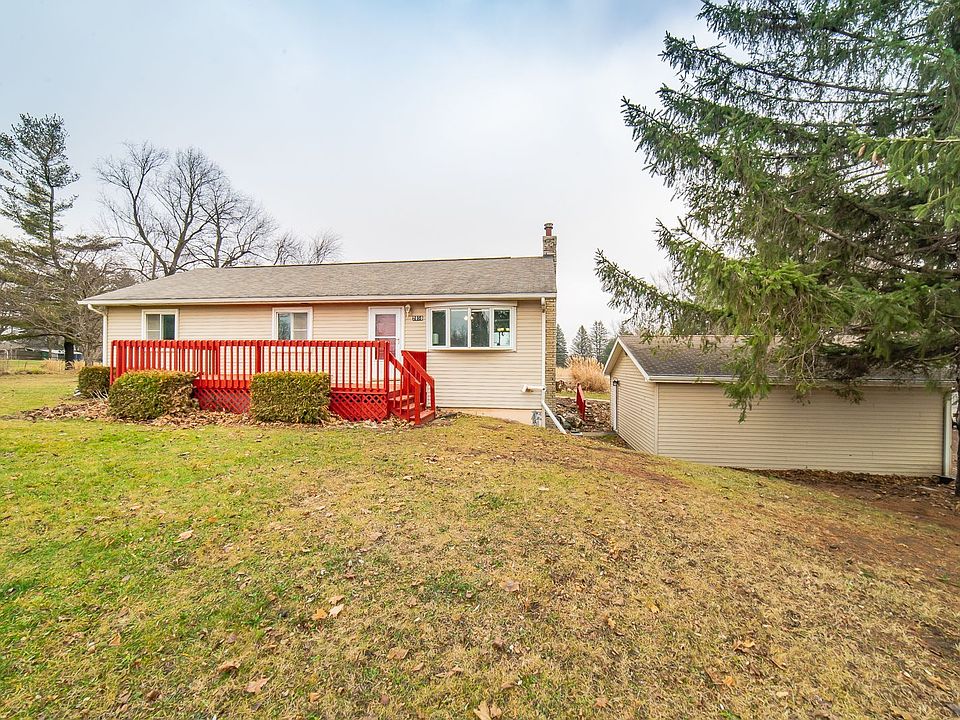 House has a great big kitchen with wood floors. Separate dining area that flows into the living room. 3 bedrooms and 1 bath. Lower level has a wood burning stove, walk out access to 2 1/2 car garage and laundry hook-up. Great big space to finish or use for storage. Possible cold storage room under porch. Terrific back decking to enjoy Alfresco dining or just relaxing and enjoy watching the wild life. Seller has planted Sorghum and has harvested 4 deer from the property.