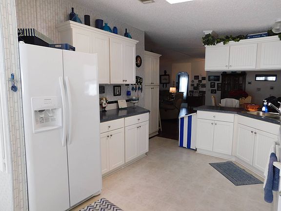Beautiful 1997 Sundance with 1512 square feet is a 2 BR- 2Bath with den that also has full closet that could be used as 3rd bedroom. This home has an open floor plan with lots of upgrades. The kitchen has new cabinets with soft closing doors and drawers, it also has a breakfast nook. Both bathrooms have newer ceramic tiling and living room, dining room and master bedroom have quality laminate flooring. Master bathroom is spacious with closet for extra storage and dual vanities. This home has an oversized carport with golf cart path for ease in/out of shed. Large lanai with windows over look pond and woods for a beautiful view of Florida wildlife. The home is being offered partially furnished with golf cart at $182,000 and monthly lot lease is $910.00. Give us a call for your private showing. Don't miss out on this one. The seller is motivated. The fees include the use of two pools, two hot tubs, fitness center, tennis courts, bocce ball courts, pickle ball, horseshoes, clubhouse, 24 Hour Manned guarded gate, lawn mowing and trash pickup. This community also offers 2 Golf courses, a (Championship Course and Executive Course) or you may purchase a membership or a 'pay as you play' option.