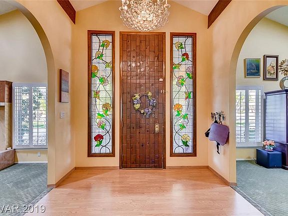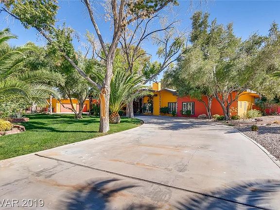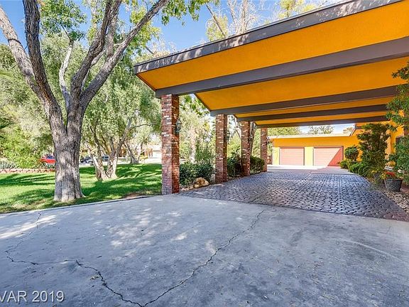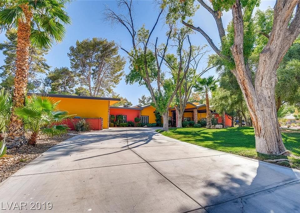 OWN A PIECE OF VEGAS HISTORY w/this Absolutely Incredible Mid Century home built by Joe Blasco in a private 7 home subdivision. 5 bed/5 bath in main house. 2 living rooms, theater room/office, custom front door w/stained glass sidelights, 1400 sqft guest house. Tennis Court. Double RV Garage. Huge pool w/dolphin design, slide & diving board. Jacuzzi. Outdoor kitchen. Putting green. Large porte-cochere & driveway. Minutes from strip & airport.