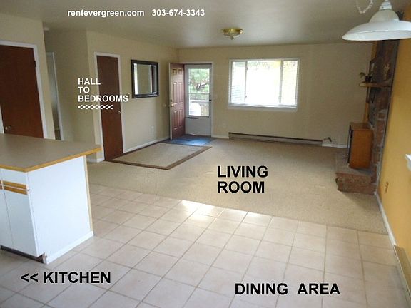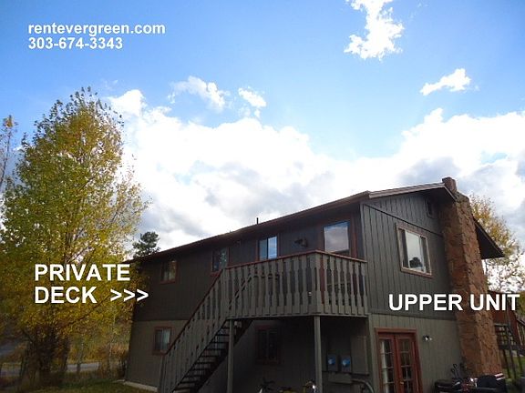 3 Bedrooms near downtown Evergreen, Upper Unit (stairs), 1 Full Bath, Laundry Hookups, Open Kitchen and Living Room, Updates, Mountain View, Prefer No Pet, short walk to a neighborhood Playground and Hiwan Homestead Museum , Deck, Private Entry, shared yard (no fence), easy driveway, RTD Bus Stop, local Elk Herd is a frequent visitor, SUNNY! Tenant pays Xcel Energy Electric. Water and Sewer Included.