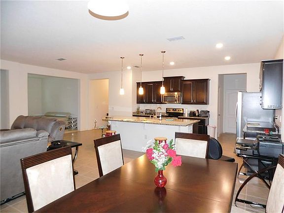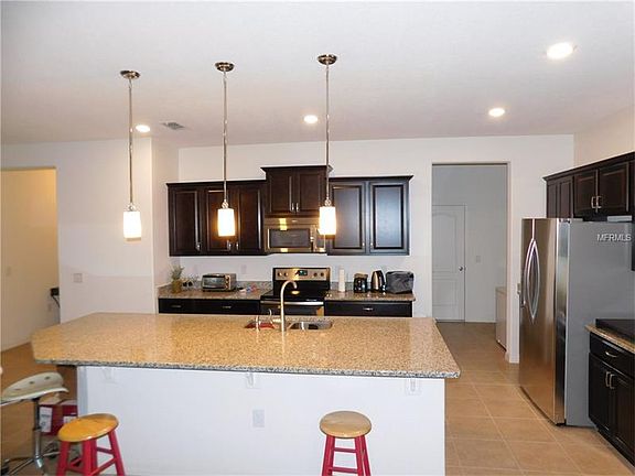Beautiful brand new home built by KB Homes-Orlando. Owner selected lots of upgrades. Granite counter tops, upgraded kitchen cabinets, wine bottle storage, 36" raised panel Birch, update knobs, cabinet above refrigerator, granite in master bath and 2nd bath, undermount sinks, Framed vanity mirrors, shower with tiles surround, elongated bowl, flood lights with motion detector, recessed lights, 52" ceiling fans, exterior electrical outlets in patio with sink hook-up, Sedona glass entry door, rounded corners, faux wood window blinds in all rooms, Extended covered patio screened.