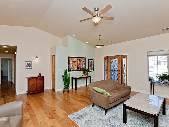 Come visit this pristine Ranch style home that has so much to offer. 3 bedrooms plus an office and split bedroom design. Kitchen offers granite counters, Shaker style cabinets, all appliances, and large kitchen window. Wood floors with no carpet, vaulted ceilings, custom doors, forced air heat, central air conditioning, and Rinnai water system. Private backyard, fenced with a pergola, and raised garden beds. Backs up to open space and side space. Two storage sheds and RV parking. Come take a look today.