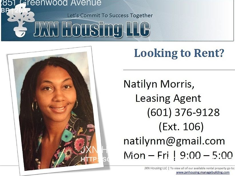 SCHEDULE A SHOWING ONLINE AT: showmojo.com/lh/5d31e6e050 HUD vouchers are accepted. How to lease a house from JXN Housing: JXN Housing (found on the web at www.jxnhousing.managebuilding.com) is a MS Licensed Real Estate Brokerage and Property Management Company. We lease property all over town, and in all price ranges. If you would like to lease a house from us please: 1. Browse the entire website, and look at all of our available units. 2. Schedule an appointment to view the house you want by either using our nifty scheduling feature on the website, or simply calling our office at 601-376-9128 and speak to the one of the leasing agents (or a staff person) at extension 2. (If you'd like to speak with a specific leasing agent simply call us 601-376-9128, and press extension 106 to speak to Natilyn!) 3. Once you've found the house you want, or if you already know which one you want - file an application on our website (or by copying and pasting this link into your browser 4. Complete the application by answering the questions sent to you from TransUnion Smartmove, and send your pay stubs to the office manager at support @ jxnhousing . com or via fax at 601-510-9564. 5. Finally, once you find out if you are approved call the office (601-376-9128 extension 2) and schedule a time to come in. You will need to either bring in your deposit which will hold the house for you, or bring your deposit and first month's rent into the office - and you can move in. Should you have any questions, please call our office (601-376-9128 extension 2). Our office is locate in Belhaven, around the corner from McDade's Market, and our regular office hours are 9:00 AM to 5:00 PM. Office address: JXN Housing 1104 N Jefferson St. Jackson, MS 39202 support @ jxnhousing . com W: 601-376-9128 Ext. 2 F: 601-510-9564