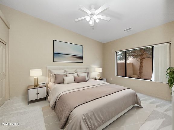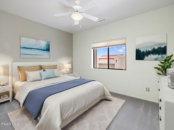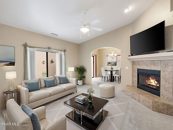 Welcome to this move-in-ready, carefree 2-bedroom, 2-bath home, offering easy living at its finest. Enjoy peek-a-boo views of Granite Mountain from the front guest bedroom. The spacious kitchen boasts ample counter and storage space, along with a tall separate pantry. Relax in the nicely appointed living room featuring a gas fireplace, vaulted ceiling, and pot shelves for displaying your treasures. Luxury remote-controlled window treatments adorn the living and dining rooms. The generously sized owner suite offers serenity and privacy, overlooking the backyard. All appliances and TV are included. The garage provides plenty of storage space. Conveniently located just minutes away from shopping, medical, Pioneer Park, Willow and Watson Lake, trails, airport, and historic downtown.