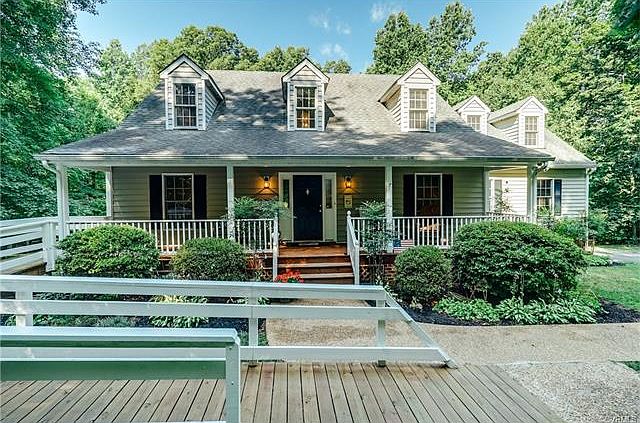 Country Charm ..close in...This beautifully-maintained 4 bedroom / 2.1 bath 2336 sq ft Country Cape on over 3.81 acres with easy access to a 3-acre lake is now available in Goochland County. Features of the home include a first-floor master bedroom with 2 walk-in closets and newly remodeled bath, pond access, attached 2-car garage, bonus room, vaulted ceilings, tons of storage, and a stone fireplace. This gorgeous house is a 5-minute-or-less drive from grocery stores, shops and Goochlands stellar schools. This Goochland home takes full advantage of its surroundings with large windows (with Sunguard window film!) to accent the outdoors. Inside you are greeted by a vaulted foyer with hardwood floors which continue throughout the entire first floor. Vaulted Family Room with stone fireplace with french doors that lead to the outdoors, with a large deck and acres of views. Also on the first floor is a dining room with french doors, eat-in kitchen with breakfast nook, a master bedroom with 2 walk in closets and a updated Master Bathroom. Upstairs there is a large loft with wood floors, two bedrooms,shared bathroom, and a bonus room