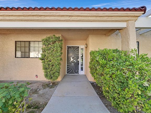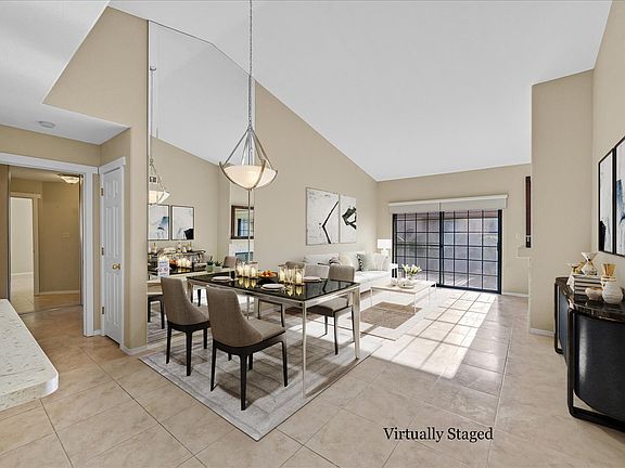 Welcome to this charming single-story townhome nestled in the highly sought-after guard-gated 55+ community of Quail Estates West. This 2 bedroom, 2 bath home offers an inviting layout with vaulted ceilings that create a spacious, airy feel throughout. The kitchen features stainless steel appliances and offers plenty of cabinet storage. Spacious laundry room with cabinets and washer and dryer. The primary bathroom has a walk-in shower, jetted tub, and a skylight that fills the space with natural light. From the living room, step through sliding glass door to your own private back patio - ideal for enjoying morning coffee or unwinding in the evening. Low maintenance lifestyle and access to amenities, this home offers the perfect blend of comfort and convenience.