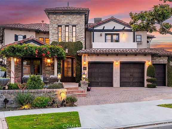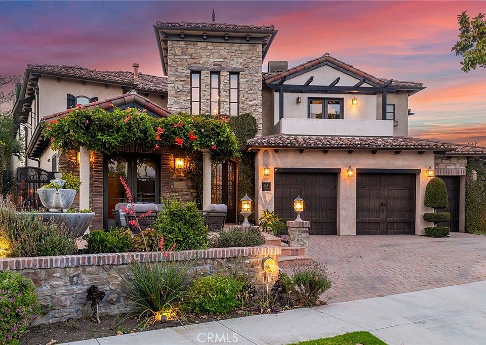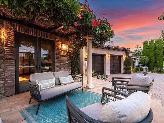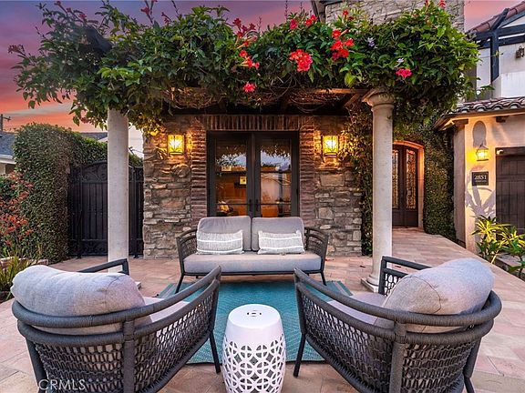 Nestled in the heart of Rossmoor, this two-story Mediterranean Villa epitomizes elegance and charm, offering a blend of sophistication and playful eccentricity across five bedrooms and five and a half baths. Approaching the residence, a grand façade welcomes you with an elevated front porch, soothing fountain, picturesque pergola, and a two-and-a-half-car garage. The custom-made arched front door, crafted from espresso-stained wood, wrought iron, and textured glass, sets the tone for the villa's exquisite interior. The foyer unfolds dramatically with a two-story ceiling, striking wrought iron chandelier and luxurious Spanish tile flooring. To the left, a tastefully appointed office with double doors to the front porch and convenient half bath cater to guests. The living room, distinguished by its beamed ceiling and a central stone fireplace and Media center, draws a captivating sight to the saltwater pool and backyard oasis. Flowing seamlessly to the expansive kitchen, a culinary masterpiece boasting a hammered copper double sink set behind a welcoming breakfast bar. The kitchen features top-tier amenities, including a six-burner gas cooktop, Dacor oven, warming drawer, and a Sub-Zero built-in fridge, ample storage cabinets and additional breakfast nook. The main floor hosts a luxurious primary suite, with a coved ceiling, direct backyard access, and an expansive en-suite bathroom which indulges a double custom vanity, a step-down travertine shower, a separate jet tub, and an extensive walk-in closet. Central to the villa's design, a tranquil courtyard beckons with a cozy fireplace. Adjacent, a studio apartment provides private living space complete with its own entrance, kitchenette, and three-quarter bathroom. Upstairs, a three-person workstation, spacious laundry room and abundant storage plus three additional bedrooms, two connected by a Jack-and-Jill bathroom, Another bedroom, with beamed ceiling and double doors to private balcony and bathroom connects to a versatile game/family room equipped wet bar and double doors to balcony overlooking pool. The backyard is an entertainer's paradise with a covered patio, beamed ceilings with fans, and recessed lighting, full bar setup w/sink and refrigerator, built-in BBQ and a black-bottom pool and spa w/water slide and rope swing invite relaxation and recreation. A pool bathroom, oversized brick fireplace on the artificial lawn adds warmth and ambiance. Located within the esteemed Los Alamitos School District.