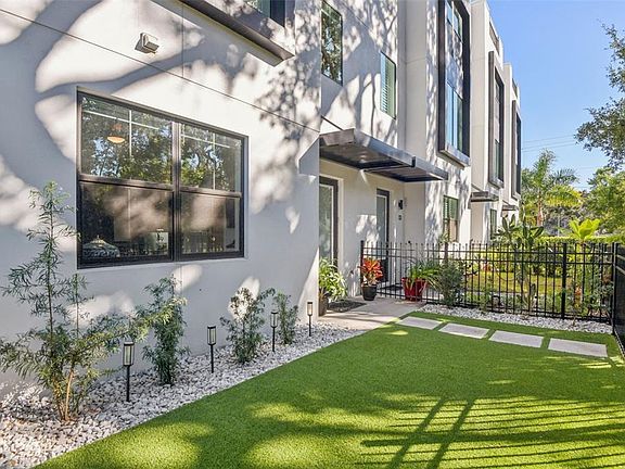 Welcome to refined urban living just moments from Bayshore Boulevard. This meticulously maintained 3-bedroom, 3.5-bathroom townhome with a private office perfectly blends contemporary sophistication with everyday comfort. Built in 2022, this residence spans 2,574 square feet of thoughtfully curated space designed for both entertaining and relaxation. The open-concept main level boasts soaring ceilings, designer lighting, and luxury flooring throughout. The chef’s kitchen is a true centerpiece, featuring premium stainless steel appliances, quartz countertops, custom cabinetry, and an oversized island ideal for casual dining and social gatherings. The dedicated office or flex room provides a bright and private workspace adjacent to a stylish half bath. Upstairs, the owner’s suite offers a serene retreat with two generous walk-in closets and a spa-inspired bath showcasing dual vanities and a frameless glass shower. Each additional bedroom includes an en-suite bathroom for optimal comfort and privacy. An entertainer’s dream, the private rooftop terrace features turf flooring, a wet bar, and a mini fridge—perfect for morning coffee, sunset cocktails, or al fresco dining under the stars. A two-car attached garage, ample storage, and a fenced backyard area complete the home’s impressive amenities. Located near Gandy Boulevard, this residence offers convenient access to Bayshore Blvd, Hyde Park Village, downtown Tampa, fine dining, shopping, and entertainment. Experience the ultimate in modern South Tampa living—schedule your private showing today.