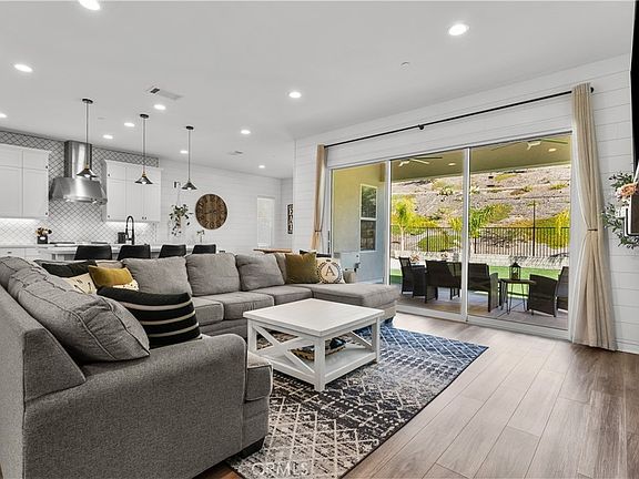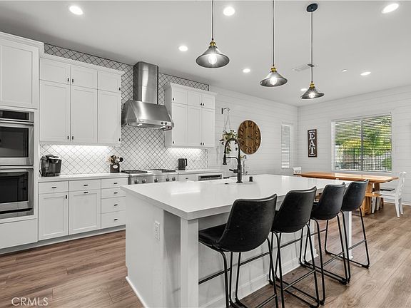 The kitchen is a chef's dream, boasting premium quartz countertops, backsplash to the ceiling, farmhouse sink, builder's highest appliance package, dual oven, and a huge triple slider opening to the patio for seamless indoor/outdoor living. Industrial shiplap accents, a modern brick electric fireplace, and stylish accent walls bring warmth and charm throughout. Outside, the low-maintenance landscaping features high-quality turf, and the home comes partially furnished for added ease.