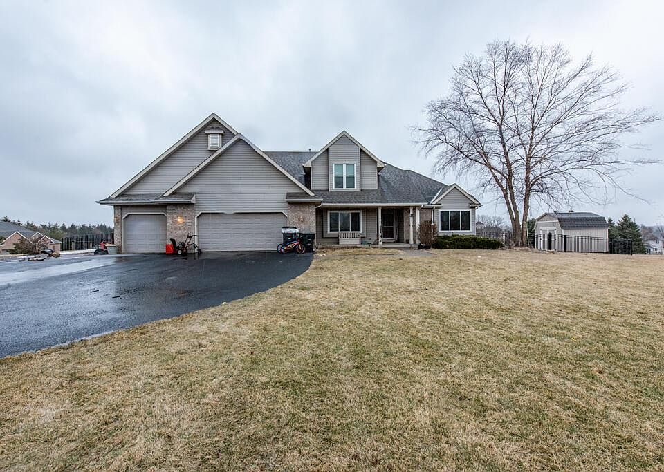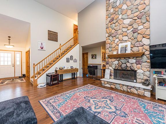 Remarkable Two Story Home in Desirable Salem Hills Subdivision. You will walk into this one & fall in love. Enter into your living room w/stunning double-sided floor to ceiling stone gas starter fireplace & vaulted ceilings. You'll love the spacious main floor master bedroom w/ ensuite, whirlpool tub, separate shower, double sinks & huge walk-in closet. Kitchen includes all appliances, breakfast bar & pantry. Dining space has cozy feel w/fireplace & sliders to deck. Main floor laundry. Nest thermostat & smart LED bulbs throughout. Upstairs features 3 great sized BRs & full bath. Lower level includes large fam rm, rec rm, exercise rm, wet bar & walkout to entertainment area set up for gas grill & fridge. Separate sitting area for cozy firepit. One-acre lot w/pool, playset and new shed.