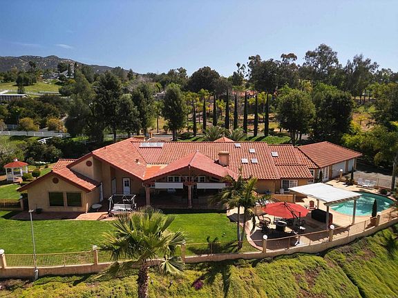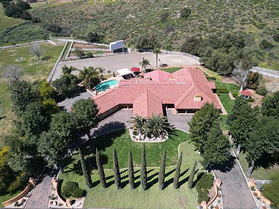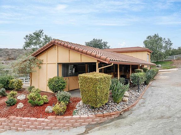 BACK ON MARKET - BUYER COULD NOT PERFORM - Nestled in prestigious Rancho Jamul Estates, this luxurious Spanish-style ranch boasts exquisite details and expansive grounds. A Spanish tile roof (new in 2020) and porte-cochere welcome you, complemented by towering Italian Cypress trees. The property spans 2.7 acres, appearing much larger due to easements and protected open space. White vinyl, 3-rail rail fencing, and an electronic fence enclose the property and ensure ample exercise of and safety for your pets. The manicured grounds feature 8 stunning gardens amid lawns and trees, including Oak, Silk Oak, Sycamore, Cypress, and Pepper varieties. Fountains, pergolas, gazebos, and outdoor seating add elegance and utility. Leisure abounds poolside with a fully covered pergola, built-in barbecue/bar, fountain, and sunroom - all secluded and shaded by mature king and queen palms. Adjacent is a large outdoor living area, where days and nights are spent lounging or entertaining guests, with installed shading, a rock fireplace and mantle, TV hookups and mood lighting. For those who love the night, landscape lighting is widespread and stunning. Significant usable acreage enables a range of possibilities for extended family living. An RV garage with a multi-story apartment and full bath provides another option to satisfy multi-generational home desires. Also, a huge office space within the main home is divisible to include a 5th bedroom. For horse people, this property is an equestrian’s dream. It includes a professionally-installed lighted dressage court with Nike footing and sprinklers. Trail riding can commence right off the property and includes 4,000 acres of trails in the beautiful Hollenbeck Canyon nearby. When not working, your horses can lounge in one of three fenced corrals or in a custom 4-stall shed row barn with rubber mats and automatic waterers. The barn also includes 2 tack rooms and a large storage room. A productive well and fully-owned solar panels, easily meet all home, landscaping, and equestrian needs. Inside, the 4,225 square foot single-level home offers a seamless blend of luxury and comfort. Highlights include Saltillo tile flooring, floor-to-ceiling windows, skylights, stucco walls, gas fireplaces and extensive built-ins throughout. The kitchen features Viking appliances, a large island, and custom dinette. The master bedroom is light and spacious with a large sitting room and walk-in closet. The master bath is tiled floor to ceiling and features 2 rainfall showers, a bathtub, steam room, and towel heaters. The property is move-in ready for you to start exploring the estates or adjacent trails on horseback, relax in the pool, entertain friends in the outdoor living with gorgeous views of the Jamul mountains, or walk to one of San Diego’s best wineries.