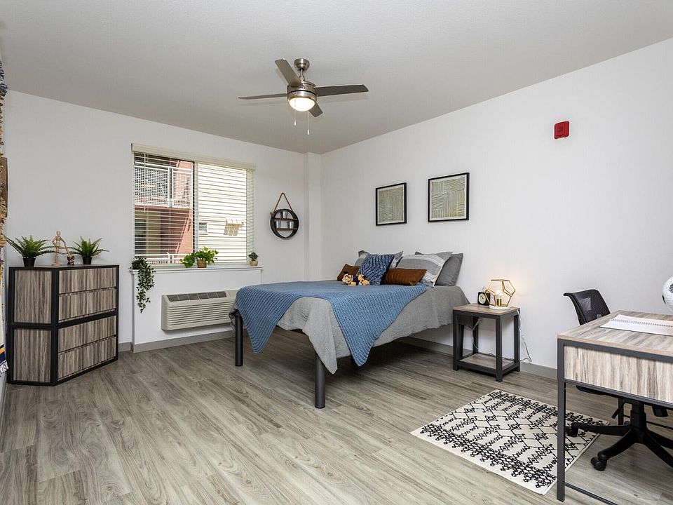The room is a cozy and practical space, ideal for two people. Each occupant has their own comfortable single bed, positioned on opposite sides of the room to ensure privacy. Beside each bed, there's a sturdy desk paired with an ergonomic chair, creating a perfect study nook for productivity and concentration. The room is furnished with modern essentials, including ample closet space for both residents to store their belongings neatly. The private bathroom, accessible from within the bedroom, is sleek and clean, featuring a shower, two sinks with a mirror, and a toilet. The overall decor is minimalistic yet inviting, with neutral tones accented by warm lighting to create a welcoming atmosphere. The unit is fully furnished, meaning all the basics are covered beds, desks, chairs, and storage solutions making it easy to move in and feel at home right away. This shared living space strikes a balance between communal living and personal comfort, ensuring both functionality and coziness for its residents. Looking for someone to take over my room. 6 months with extension possibility! original rent is 1286 but I am willing to give you 1000.