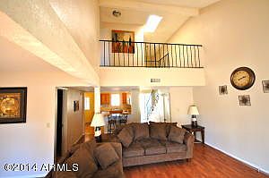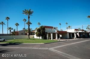 MOVE-IN READY. Right in the middle of Arcadia and Old Town Scottsdale! Boasting one of the largest models in this quaint GATED community this property is a must see! This end unit home features Vaulted Ceilings, 3 bedrooms, 2 updated bathrooms, laminate and Tile flooring and BRAND NEW carpet. Large kitchen space opens on the wide open living and dining room. BRAND NEW ROOF- 2012.... A LOT of functionality here and at this price will go quick! Well maintained community with plenty of parking, grassy areas and POOL! Check out the low HOA fees too!- $88/mo!