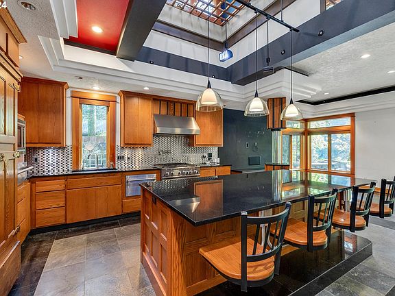 The builder designed this home and built this home-it is truly an extension of himself and his dream-all on a beautiful spot on the Sandy river. Experience a one-of-a-kind living in this custom-built home Offering serene river views, this property has striking architectural design, with tall ceilings, skylights, and gas fired hot water heated floors throughout including the garage.The roof is a lifetime roof.The floors are 18"x18" slate and black tile.The living room and the master bedroom have Cyclone gas glass cylinder fire tubes.Also a beautiful antique wood stove in living room for cozy winter fires. Conveniant central vac system. The gourmet kitchen, features a custom antique-style icebox refrigerator, granite countertops,a 5ftx10ft oversized granite island with attached bar seating. The seamless indoor/outdoor kitchen with built-in BBQ, sink, and refrigerator is perfect for entertaining year-round. This home's layout is as functional as it is unique, with grand teak wood and glass pocket doors to define spaces as needed.The home has a life of air circulation system to remove heat or cool air. The primary suite is a true retreat, built-ins, dual sinks, and a soaking tub for ultimate relaxation. Additional highlights include a spacious attached 2-car garage with heated floors and upstairs storage, and a massive detached 4-bay shop with RV storage and a bonus office space area above.This home must be seen to be fully appreciated.