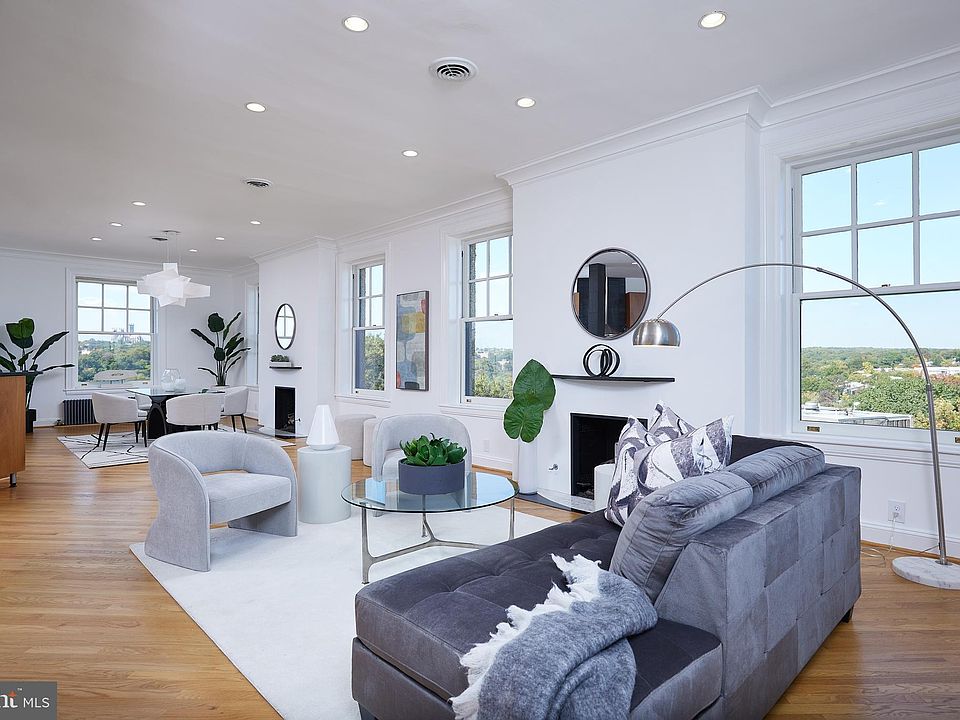 Premier Ontario Penthouse brings together modern interiors in an iconic Beaux Arts building set on three verdant acres. It will be shown by appointment only. The Ontario 605|607, is an expansive 3 bedroom, 3 bath single level home spanning 2,768 square feet, one that has been stylishly updated at every turn and thoughtfully planned with contemporary comfort in mind. This extraordinary home is a private wing of the building. Magnificent views are enjoyed from this top floor home. An elegant foyer leads to the light-filled living area, a spectacular space featuring oversized windows, memorable views with three exposures and custom built-ins. The open floor plan includes multiple seating areas, a spacious dining area and two fireplaces. A state-of-the-art kitchen with quartz counters, warm wood cabinetry, and premium appliances is an entertainer’s delight. The three ensuite bedrooms are private and positioned apart from one another. In addition, you’ll find a home office, a well out-fitted utility room, a laundry and ample storage. This beautiful home also features two zone central air and three working fireplaces. Front desk service, on-site rental parking and attractive landscaping round out the many amenities that make the Ontario such a desirable community. Pets are welcome here. DETAILS: No Underlying Mortgage. Monthly Fee Breakdown: $648 Real Estate Tax + $1746 which includes Heat, Water, GM, Porters, Front Desk Staff, Landscape, CAM, Reserves and use of Storage Cages #19 & #47. Onsite Rental Parking from $105/mo. A Beaux Arts landmark building nestled in Lanier Heights, the Ontario offers lushly landscaped grounds, old-world elegance and a location that is hard to beat. Just 7 minutes to the Kennedy Center via Rock Creek Parkway and in easy walking distance to nearby Michelin-rated restaurants, the Ontario is also close to the scenic pathways of Rock Creek Park. Adventure seekers hop on the Woodley Park Metro to reach other notable DC destinations in mere minutes. An historic home with a future as rich as its past, the Ontario penthouse 605|607 is an extraordinary opportunity that rarely comes available.