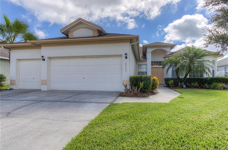 AWC - Taking Backup Offers This home is a real beauty in the sought after community of Meadow Pointe. Home offers 4 bedrooms, 2 baths plus office and a 3 car garage. Located in the front of Meadow Pointe minutes from Bruce B Downs Blvd. Brand new cabinets and countertops throughout. Engineered hard wood floors have been installed through the entire home. Quarry tile in all wet areas. Master bath has a built in wardrobe for added storage. Relax by the sparkling pool that overlooks a pond view. Other features include a tankless water heater that saves time and money - Never run out of hot water again! Newer A/C and kitchen appliances. Roof was replaced in 2013. Meadow Pointe offers many amenities. Great location - minutes to hospital, Wiregrass Mall, New Tampa Premium Outlets, Highways and so much more! Move in ready! Can close quickly!