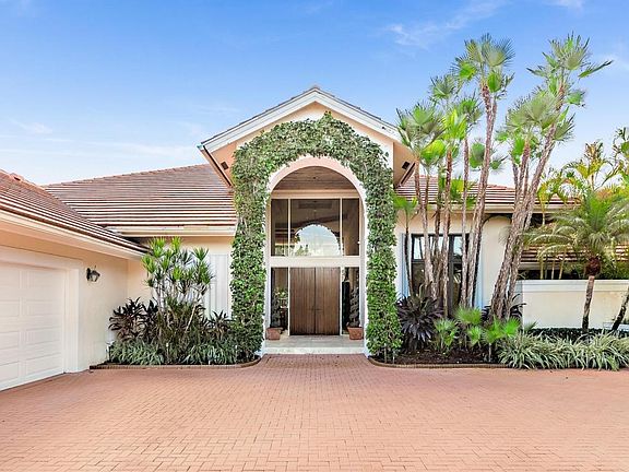 Extraordinary luxury estate with nearly 6,000 square feet of living area offering 7 bedrooms, 7 full baths and 1 half bath which includes a 1 bedroom/1 bath guesthouse on a deep navigable interior waterway in the exclusive community of Frenchman's Creek. An Ivy draped entrance leads through double decorative wood doors into spacious, open and exquisite naturally lit floorplan with high ceilings, neutral decor, beautiful beamed ceiling detail and wood paired with marble flooring. A spacious dining room with wall sized picture window and wood beamed ceiling; Recently updated custom kitchen with thick granite countertops offers center island stove top, double ovens and sunny breakfast nook; Custom office with built-in desk and shelving, crown molding and custom wall faux..