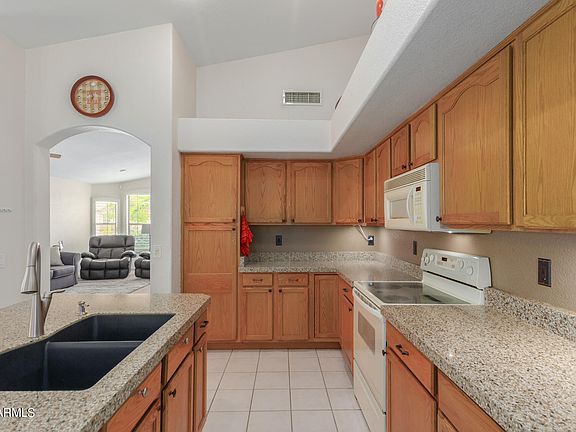 Welcome home! Mesquite Canyon - 4 bedrooms, 2 bathrooms, and a 3-car garage is now on the market! Mesa Taxes, Gilbert Schools, walk to neighborhood park, a block from Loop 202, near lots of shopping, restaurants, freeways, and golfing. Come inside to find an appealing interior boasting a bright & airy living room with a blend of tile & carpet flooring, high vaulted ceilings, and plantation shutters. Large eat-in kitchen provides plenty of honey oak cabinets, built-in appliances, granite counters, recessed lighting, and a prep island with a breakfast bar. Main bedroom offers a walk-in closet and a bathroom with dual sinks. Finally, the spacious backyard includes a covered patio and 3 storage sheds. Don't let this fantastic abode escape!