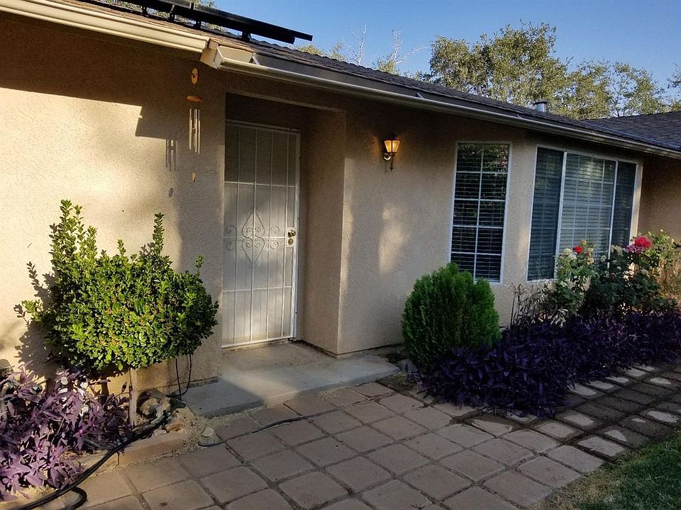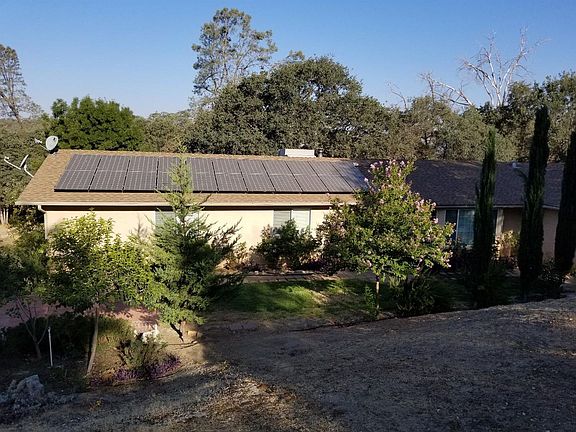 This is a very quiet, secluded location. End of the road, 5 acres of beautiful gently sloped land towards the seasonal creek. A fully paved entry driveway all the way to the house and cirle. Built in 2002, the 3/2 is great, open Kitchen and giant Great room. The garage is very cool, its 2 two car garages staggered behind one another so you can park extra cars/storage or have a huge workshop and still park the cars! There is a half bath in gargae. A paid for solar field is on the roof, power bill averages about 20 bucks! Drip irrigation, lots of foilage & flowers, a couple out buildings for storage and top it off with a house long covered concrete patio! You can relax and enjoy the days and evenings with no worries or busy anything!Sierra Schools
