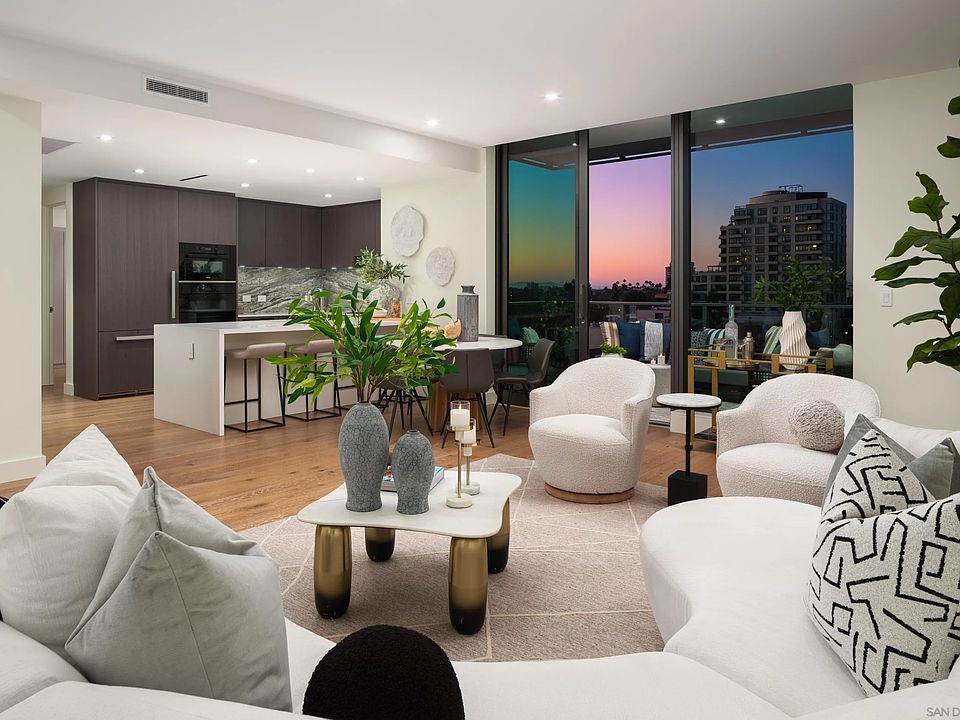 Seller offering to buydown buyer's interest rate to 4.25%. Inquire for details. The Park, Bankers Hill, has swiftly become San Diego's most coveted address, exuding prestige and elegance at every turn. This sophisticated corner residence showcases the pinnacle of European craftsmanship and design, offering breathtaking, uninterrupted views of the verdant lawns and stately trees of Balboa Park—an irreplaceable perspective into the nation's largest urban park. The grand gallery entrance gracefully unfolds into an open-concept living space, with floor-to-ceiling glass walls that seamlessly blend indoor luxury with the natural beauty outside, creating the sensation of living within the park itself. The meticulously curated interiors feature exquisite Du Chateau hardwood floors, Miele appliances, stunning waterfall-edge Caesarstone quartz countertops, and sleek Boffi Italian cabinetry. This architectural masterpiece boasts a highly sought-after split-bedroom floor plan, complete with a serene master ensuite encased in floor-to-ceiling marble, and an expansive walk-in closet, impeccably enhanced with a bespoke California Closet system. The second bedroom has been thoughtfully transformed into a sophisticated home office, seamlessly integrated with a custom Murphy bed for added versatility and elegance. Savor the beauty of both sunrises and sunsets from the residence's exclusive terrace, where sweeping, unobstructed views of the enchanting Balboa Park unfold before you.