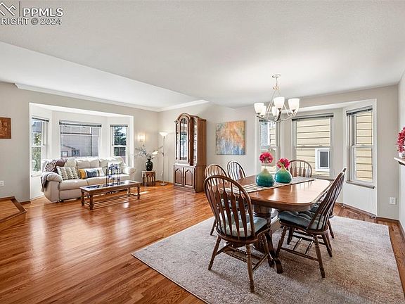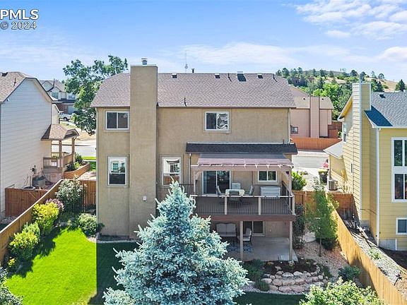 WOW! This gorgeous D20 home shows pride of homeownership! Original owners babied this immaculate "Vail" model home, and kept everything up-to-date. Stunning ¾” hardwood floors, walkout basement, mountain views, stainless steel appliances and a spectacular Master Suite! Enjoy gatherings in the open kitchen with Santa Lucia granite counters, island, custom tile backsplash, deep pantry, stone sink and an amazing view of the mountains. Kitchen flows into country dining & family room with cozy fireplace. And, OH! the backyard! It’s immaculate with custom landscaping including peonies, dogwood trees, flagstone pavers, and fully fenced! Take advantage of Colorado outdoors on the easy-to-maintain composite Trex deck with iron spindles, covered pergola and awning. Upstairs relax in your Massive Master Retreat with walk-in closet featuring cedar flooring & premium bathroom with Corian counter double vanity, tile flooring, soaking tub and standup shower. Layout is perfect for families with three additional bedrooms on the upper floor, or one with French doors could be an office with magnificent mountain views, and another full bath with dual vanity. Lower level includes guest suite with bedroom, bath, and a wonderful recreation room with walkout to the backyard for the family to enjoy playing games or watching a movie. Whew! That's not all...here are some teasers! International Baccalaureate schools, Brand NEW Class 4 shingle Roof, A/C, newer windows and flooring, quartz counters in ½ bath with custom frosted laundry door, over-sized garage offers plenty of added space, epoxy floors, extra insulation, and cabinets, plenty of parking for guests, 2023 water heater, LARGE bedrooms & closets. Excellent, well-maintained home worthy of investment for anyone. Ideally situated near John Venezia Park, trails, Focus on the Family, luxuriant Shops at the Promenade, brand new restaurants, 21C Library, easy access to I-25, Air Force Academy, Children’s Hospital! NO HOA. IT WON'T LAST!