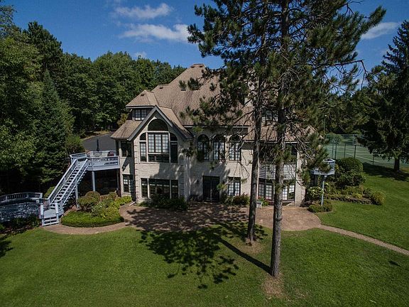 Luxury home is nestled on beautifully landscaped grounds with end of the road privacy on 398-acre Squash Lake. This elegant home features a grand entry leading to a formal living room with fireplace and wall of windows overlooking lake. Just off the entry is a sitting area and a formal dining room. Bright office/gathering area adjacent to gourmet chef’s kitchen features seating area with fireplace. Breakfast eat-in area has a door accessing a deck with views overlooking backyard and lake. Large master bedroom suite features a sitting area with fireplace. En suite bath is stunning with large jetted tub and glassed in shower. Each of the home’s other bedrooms features its own private bathroom. Lower level has large open living area with fireplace, office area, kitchen and an additional master suite with sitting area and full bath.