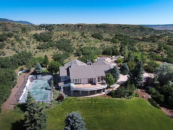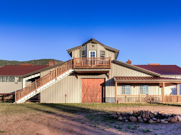 Working ranch in northern Colorado Springs, located north of the Air Force Academy on 213 uninterrupted acres (6 parcels of 35.5 acres each). a two story house with 3 bedrooms and 3 bathrooms, including a master bedroom on each floor. Near the house is a Basketball court, outdoor kitchen, hot tub and water features on a flagstone patio (A portion is covered and heated). Barn includes an office, a bathroom and a heated indoor riding arena. 5 stalls with outdoor runs are across from a wash bay and two rooms, one with attic access. Above the barn is a studio apartment with washer/dryer, bathroom and kitchen.