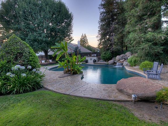 Work from home in a private park-like setting! Watch attached video tour . Welcome to this beautiful 3/2 custom home with detached office/studio/4th bedroom in an upscale neighborhood where homes rarely hit the market. Upon entering you'll notice the amazing architectural arches, beautiful hickory hardwood floors & unique ceilings in every room. This home has been meticulously upgraded throughout. Enjoy both formal & informal dining as well as breakfast bar which leads to an upgraded kitchen that includes granite counters, custom backsplash, large pantry & windows overlooking the stunning yard. The living room offers thermostat controlled pellet stove built into a classic brick fireplace. The master bedroom has 2 walk-in closets, vaulted ceilings, access to the back yard & spa-like bathroom with travertine walls, sunken roman tub & unique room-heating ceiling fan. Step though French doors to the covered patio & picture yourself entertaining in the huge back yard with sparkling pebble tech pool, waterfall, custom gas fire pit, stamped concrete, built-in BBQ & outdoor speakers. Head down the path to a private retreat that has French doors, a/c wall unit, exposed beam ceilings & ceiling fans & make it your own. Add award winning Clovis Schools, RV parking, NEST system, security cameras, walk-in attic, tons of storage & much more & you've got everything your family needs. Bed/bath/sqft differs from tax records. Detached room can be 4th bdrm with closet.