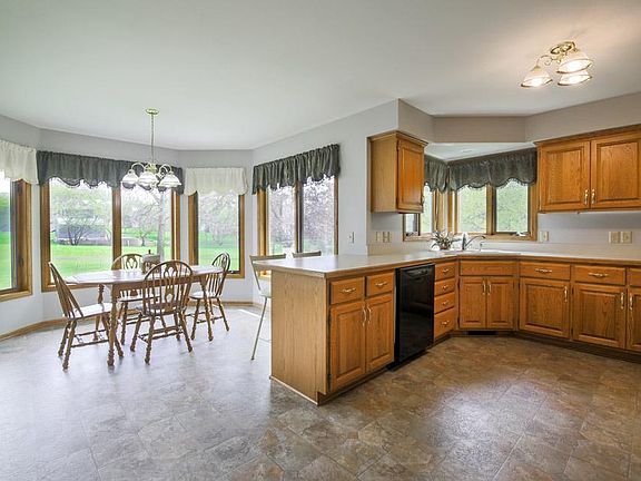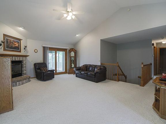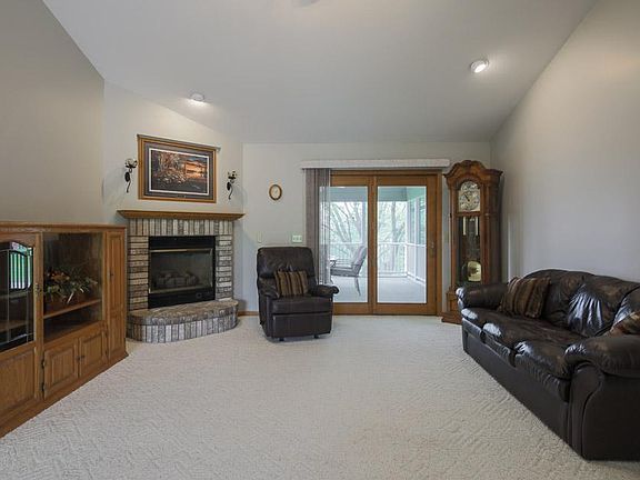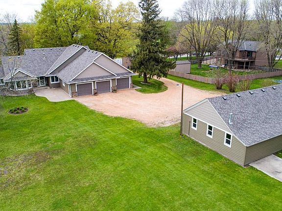 Distinctive 3+ bedroom, 3 bath Rambler with 6 garage stalls. Beautiful 1.5 wooded acres on the edge of town across from city park. Builders own home has been meticulously maintained. Entire exterior all new in 2020 with new roof, gutters, soffits, facia and LP Smart Board. Master suite has gas fireplace, full master bath and huge walk-in closet. Finished lower level features 29x25 family room, built-in hot tub, wine/fruit cellar, hook up for wet bar. Separate entrance for a business or mother-in-law apartment. Approximately 2,000 sq. ft. on each level. Sheetrocked and insulated oversized 3 car garage plus 44x26 detached garage/heated workshop. Relax and enjoy sunsets and nature from 16x16 screened porch. Lots of storage and many extras. Call to see!