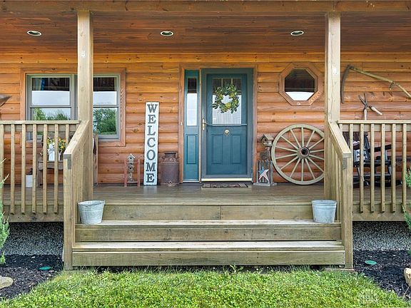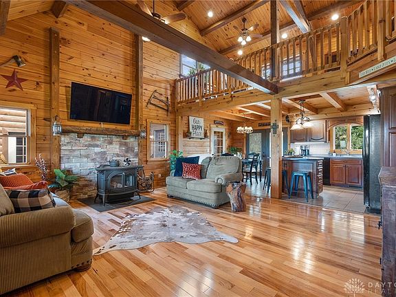 Vacation Living Everyday! Beautiful 3200 sq ft log home offers tranquility and rural charm, situated on 2.13 acres. This home’s location offers optimal accessibility with an easy commute to Wright Patterson, 10 minutes to Rt 35, 4 minutes to I-71, 40 minutes on I-71 to the I-275 beltway in Cincinnati, and a mere 38 minutes to Downtown Dayton. At the heart of this exquisite dwelling is the recently revamped great room, showcasing a new hearth and a cozy buck stove, infusing a sense of warmth throughout the space. Seamlessly transitioning into the attractive kitchen with bar island and adjacent dining area, it presents a setting, ideal for hosting memorable gatherings with friends and family. Two bedrooms (16x13 and 14x11), a full bath, and laundry completed the first floor. A sizable loft adorns the second floor, currently serving as a home office. Its multifaceted design offers limitless possibilities for you to express your creativity. The second floor also features a 16x20 bedroom and full bath. The finished basement features a family room, a second kitchen adorned with hand-crafted wooden cabinets, and a guest room or den with fireplace and a full bathroom, ensuring your visitors' comfort. The second laundry room, mechanical room, and storage area complete the lower level. The inviting front and rear porches, perfect for savoring a summer's day breeze with your favorite beverage, add to the property's alluring charm. A 10x7 mudroom connects the home to another great feature of this property, the 4-car tandem drive-through garage with a workspace that is certain to thrill car enthusiasts. A finished, heated living area with a half bath above the garage, offers a realm of possibilities - whether it be a man cave, a spare bedroom, or a fitness room. Recent upgrades include a new furnace/AC (2023), a new shed (2023), a new concrete parking pad/driveway and a gravel roundabout (2022), a new hearth and fireplace/stove (2020), and a new water heater (2019).