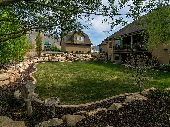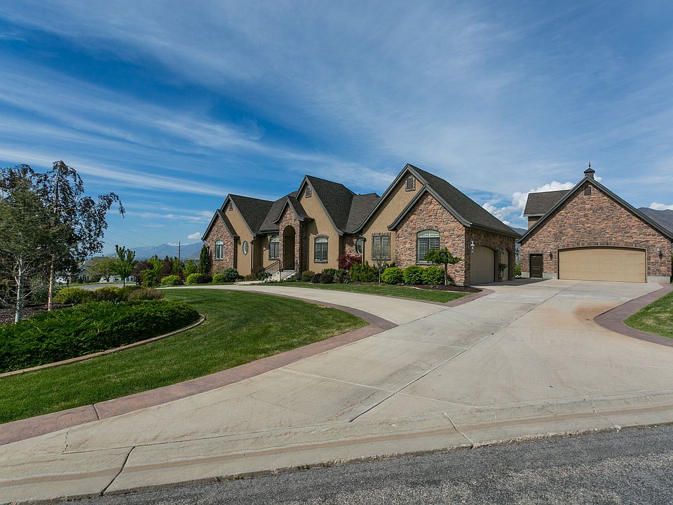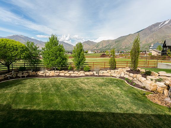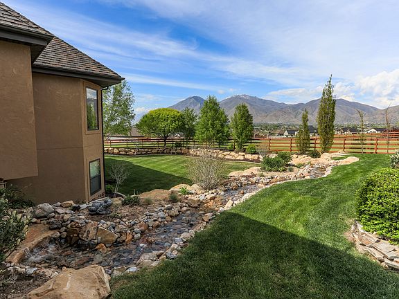 Beautiful home in Mapleton has unobstructed mountain views. Versatility and comfort at its finest! This custom built home has been constructed with the utmost quality. Including 2x6 exterior walls, Pella vinyl clad windows with plantation shutters and Hunter Douglas window coverings, knotty alder walnut stained cabinets, doors and trim. The great room and kitchen have engineered hardwood flooring. Travertine is in all of the bathrooms and both bathrooms and kitchens have granite countertops. Speaker surround system projects throughout the home and exterior patio areas. Flex room in the basement could be used as a theater room but is currently used as a playroom for grandkids. Convenient central Aqua air vacuum system (wet/dry vac) and two AC/Furnaces. Designed with two master bedrooms on the main floor and full living space downstairs including a full kitchen and walk out basement. A stream and waterfall are in the back yard and create an inviting atmosphere. The rough-in for a future pool is ready to go. The detached garage is approx. 960 sf with a MIL apartment upstairs. There is a pasture, barn and stalls. Horse stalls can be removed easily so if horses aren't your thing, you can easily convert the barn and acreage for other activities. The property does have 400 amp electrical service and the barn has 220v on a separate breaker and disconnect.