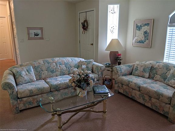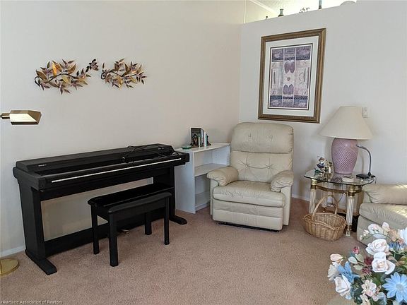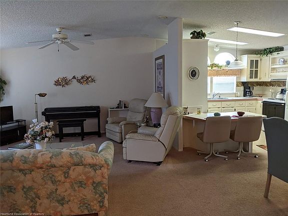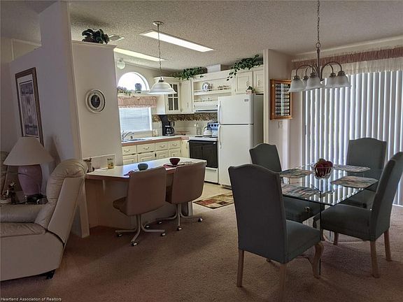 This charming and well taken care of Fleetwood doublewide is located in sought-after 55+ Highlands Ridge's rented land section, Marina Cove and the original owners have used it only seasonally. It has an open plan layout, with the living room facing the street and receiving evening sun and the screened porch at the back with morning sun. The lot is spacious and very pleasing on the eye with attractive landscaping. The roof was replaced in December 2017 and the air conditioning in February 2021. Fully furnished, including a golf cart which had new batteries in 2020. Brand new garage door opener. This is a great retirement community with many amenities. Two golf courses are adjacent to the community, fees apply. Located on Bonnet Lake, there is a boat ramp and docks, as well as a boardwalk. Gated at night. Large dogs welcome. The monthly lot rent includes grass cutting and the use of the amenities. Residency approval required prior to going to contract. $25 per person.
