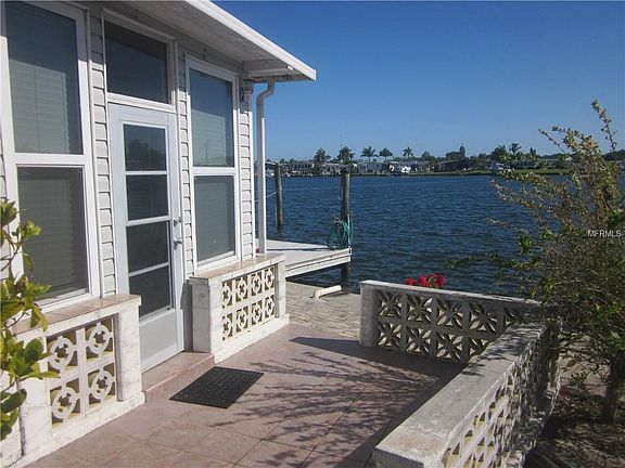 Waterfront home with dock, a double lot, and a detached garage. This 2 bedroom 2 bath manufactured home sits right on the water in the 55+ resident owned Tropic Isles community, with 50 ft plus or minus of water frontage, a new AC in 2018, and a new water heater in 2017. Includes laundry room and plenty of storage space in the various attached shed areas, plus all of the storage area in the detached garage and additional parking under the carport. The lanai at ground level contains a wall of windows to view the water at a southwest exposure. This property resides in the land owned portion of Tropic Isles and is not subject to several of the co-op regulations. Priced to sell. Home is sold as is, all measurements and community fees/regulations to be verified by buyer.