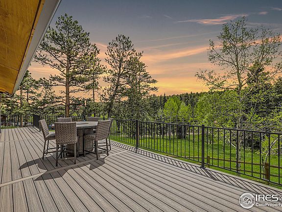 Welcome to your dream home in Green Valley Ranch, Conifer, CO. This charming country ranch is on 1.53 acres of lush pine and aspen trees, offering a serene and picturesque setting. The cedar-sided home features a covered front porch and a wrap-around deck with breathtaking views. Inside, the main level boasts an open design with ceramic tile floors in the entry and kitchen. The kitchen features granite counters, a granite island with a sink, a new GE profile electric cooktop, a Samsung black stainless steel refrigerator, a double oven, a dishwasher. The living room offers LVT floors, a wood-burning stove, and walkout access to the deck. A half bath with ceramic tile floors and a granite counter adds convenience. The primary bedroom includes hardwood floors, a walk-in closet, and an adjoining bath with ceramic tile floors, granite counters, a jetted tub, a step-in shower, and ceiling lights. The full walkout basement features a family room with LVT floors, a pellet stove, and walkout access to the patio and fenced rear yard. There are two additional bedrooms-one with LVT flooring and ceiling lights, and the other with wall-to-wall carpet, ceiling lights, and a walk-in closet. The basement includes a 3/4 bath with LVT flooring, granite counters, a step-in shower, and ceiling lights, as well as a laundry room with a concrete floor, housing a Goodman high-efficiency gas forced air furnace and a gas water heater. The property also has a 250 sq ft barn with a loft and chicken coop, perfect for hobby farming or additional storage. With efficient gas heat throughout, this home ensures year-round comfort. Located at an elevation of 8,480 feet, this home offers a unique mountain living experience with easy access via a gravel main road. Don't miss the chance to own a piece of Colorado's natural beauty with modern amenities. Schedule a viewing today and make this charming country ranch your new home.
