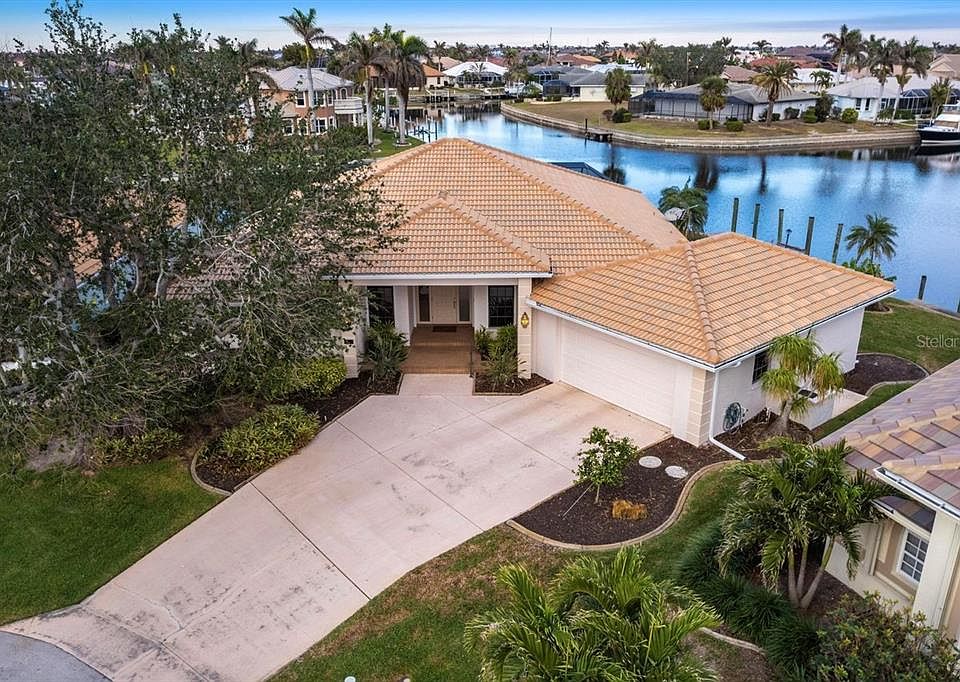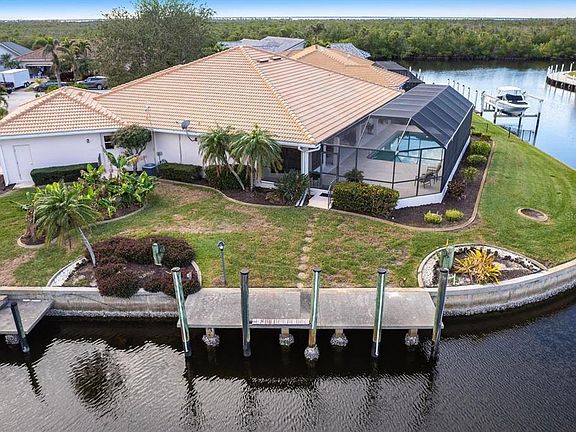 Discover unparalleled waterfront living with this sailboat access home, situated on a beautifully landscaped and coveted tip lot with over 174 feet of pristine water frontage. This property is a true gem for boating enthusiasts, offering direct access to the open waters with no bridges to navigate. Inside, this 2788 sq/ft home welcomes you with soaring ceilings in the oversized great room which flows into the formal dining room all with stunning views of the waterfront. The expansive kitchen boasts ample counter space and cabinets for all culinary enthusiasts. There is also an additional craft room in the home and a separate workshop situated in an enclosed area off the 2 car garage. There are 3 spacious bedrooms, two of which include private en-suites providing comfort and convenience. The primary bedroom is quite large with a lovely en-suite, oversized walk-in closet and beautiful views (as well as access) to the lanai and waterfront. The layout of the home is ideal for entertaining or relaxing with water views from nearly every angle. Step outside to a private backyard retreat featuring a heated pool, expansive lanai, and a wet bar—ideal for entertaining or enjoying the serene peacefulness that is unique to tip lots in Punta Gorda Isles. This home also boasts hurricane shutters, rain gutters, irrigation, 2 hot water tanks, dual zones, and a new roof (2023) ensuring peace of mind and low-maintenance living. The location within Punta Gorda Isles is wonderful as well, located at the end of a quiet cul-de-sac taking a walk to St Andrews Golf Club is always an option. Don’t miss the chance to make it yours and Chase Summer all year! Schedule your showing today!
