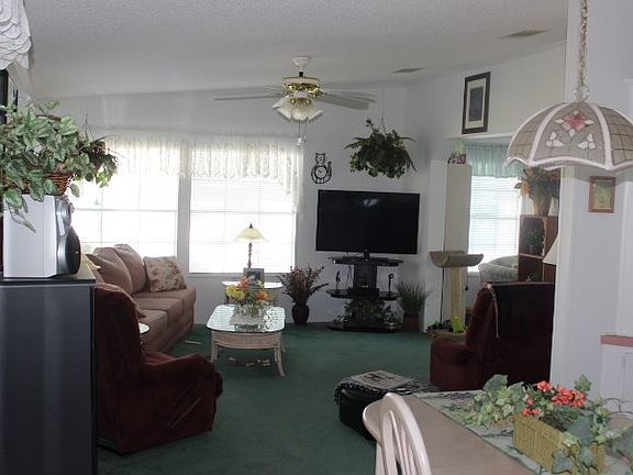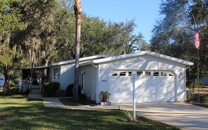 This is a well taken care of 2/2 manufactured home on leased land and it comes fully furnished with the exception of personal items - even the golf cart is included (as is). Very nice corner lot with screen porch. Spacious, attached 2 car garage. Great community with lots of activities, lake access, golf (fees apply), pickleball, tennis, etc. Gated at night.