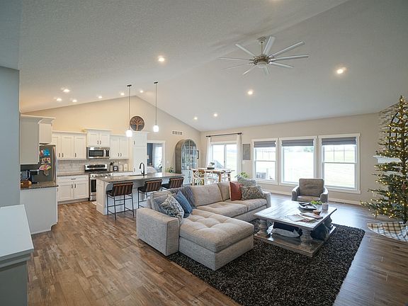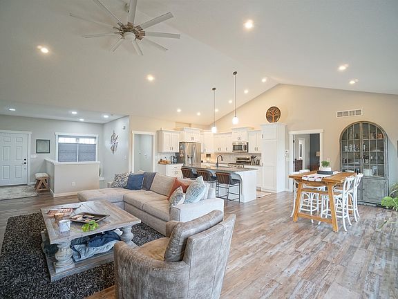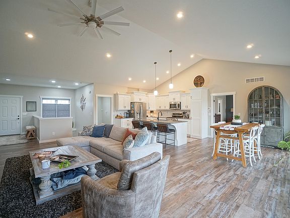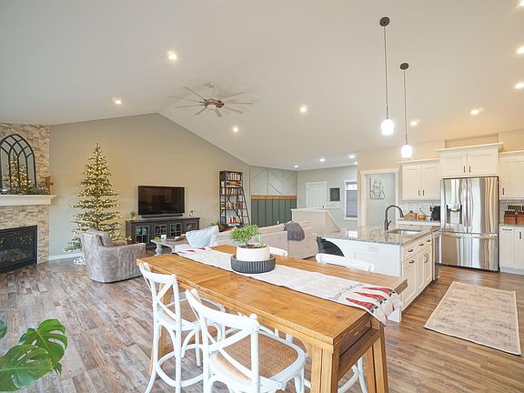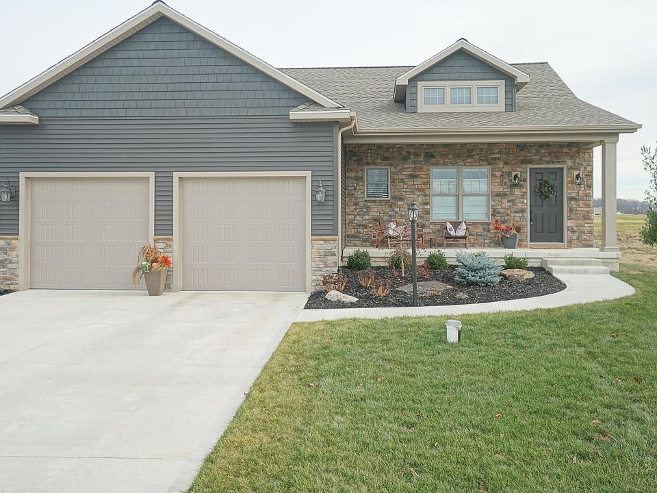 MOTIVATED SELLER SAYS BRING AN OFFER - Almost BRAND NEW! This home was completed in 2022 and has been very well taken care of. This 3 bedroom, 2 bath, day light basement, 2842 sq. ft. home has a covered porch entrance into a wide foyer area that connects to a large living room with cathedral ceilings, gas log fireplace with floor to ceiling stone work that is connected to the fully appointed kitchen with custom cabinetry and granite counter tops. The dining room area is just off the kitchen and living room with slider door access to the maintenance free deck with stainless steel cable railing overlooking the spacious backyard with firepit and views of The Stonehenge golf course. The large primary suite offers a generous sized bedroom, granite double sink vanity, walk-in shower and walk-in closet. A good sized mudroom connects the attached oversized 2 car garage to the kitchen area. Two additional bedrooms with walk-in closets, laundry room with utility sink and granite countertops, a great family room with home theatre projector and large projection screen along with plenty of natural light, utility room, and an additional storage room completes the list of this open floor plan. Outside you'll find exquisite stone hardscaping and professional landscaping that compliment the outside of this beautiful home with a maintenance free exterior. Convenient location, a premium "no fly zone" golf course lot, fiber internet, low utilities, in turn key condition along with many additional features too numerous to mention, make this home a great choice!