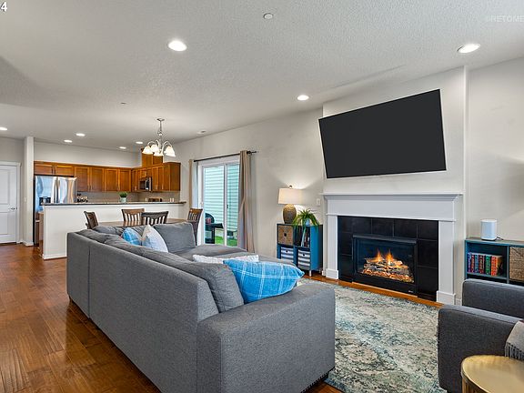 Welcome to easy Wilsonville living in the vibrant community of Villebois! This move-in ready, well-maintained home offers 1,521 SF of comfortable living space, perfectly suited for those seeking a low-maintenance and active lifestyle. Be greeted by the traditional curb appeal with a covered entry and a quaint sitting porch, ideal for enjoying your morning coffee or evening chats with neighbors. Step inside to discover a great room layout featuring a living room and formal dining area that seamlessly flow into the open kitchen. The living room boasts a cozy gas fireplace and large windows that flood the space with natural light. The open kitchen is great for entertaining, with tile and granite counters, an eat-bar, and an abundance of cabinetry for all your storage needs. Stainless steel appliances, including a built-in microwave, pantry, and a refrigerator that stays, make meal prep a breeze. Adjacent to the kitchen is a dining area with a sliding door leading to the side patio. Convenience is key in this home, with a convenient office/sitting nook and a main floor powder bathroom. Hardwood floors throughout the main level add to the home's charm and elegance. Upstairs, you'll find a serene primary bedroom suite with a vaulted ceiling and double closets. The primary bathroom features a dual sink and tile countertop vanity. Two additional bedrooms complete the upper level of the home along with a laundry room and hall bathroom. Outside, enjoy a fully fenced, low-maintenance yard with a patio and residential turf, perfect for enjoying the outdoors without the hassle of extensive upkeep. Located within Villebois, you'll have access to community parks, trails, and a clubhouse with a pool, providing ample opportunities for recreation and relaxation. This home is conveniently located to restaurants, shopping, and easy access to I-5, making it a breeze to explore all that Wilsonville has to offer! Don't miss out on the opportunity to make this delightful home your own!